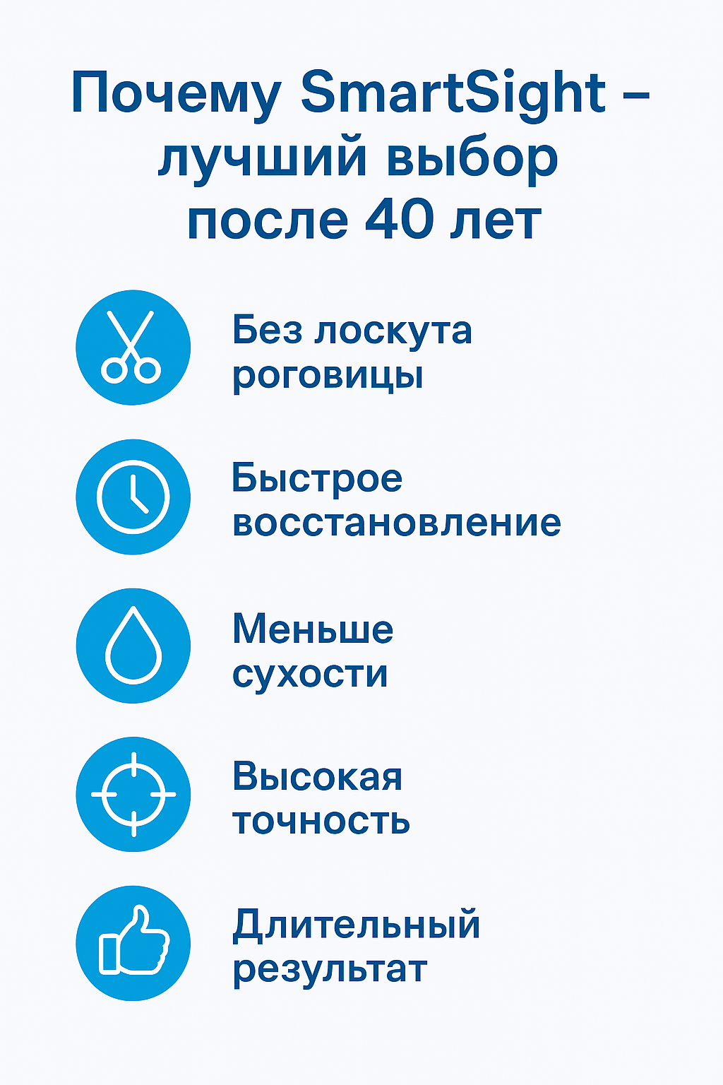 При традиционных методиках после 40 лет риск сухости выше, но SmartSight практически исключает эту проблему. - Точность коррекции.